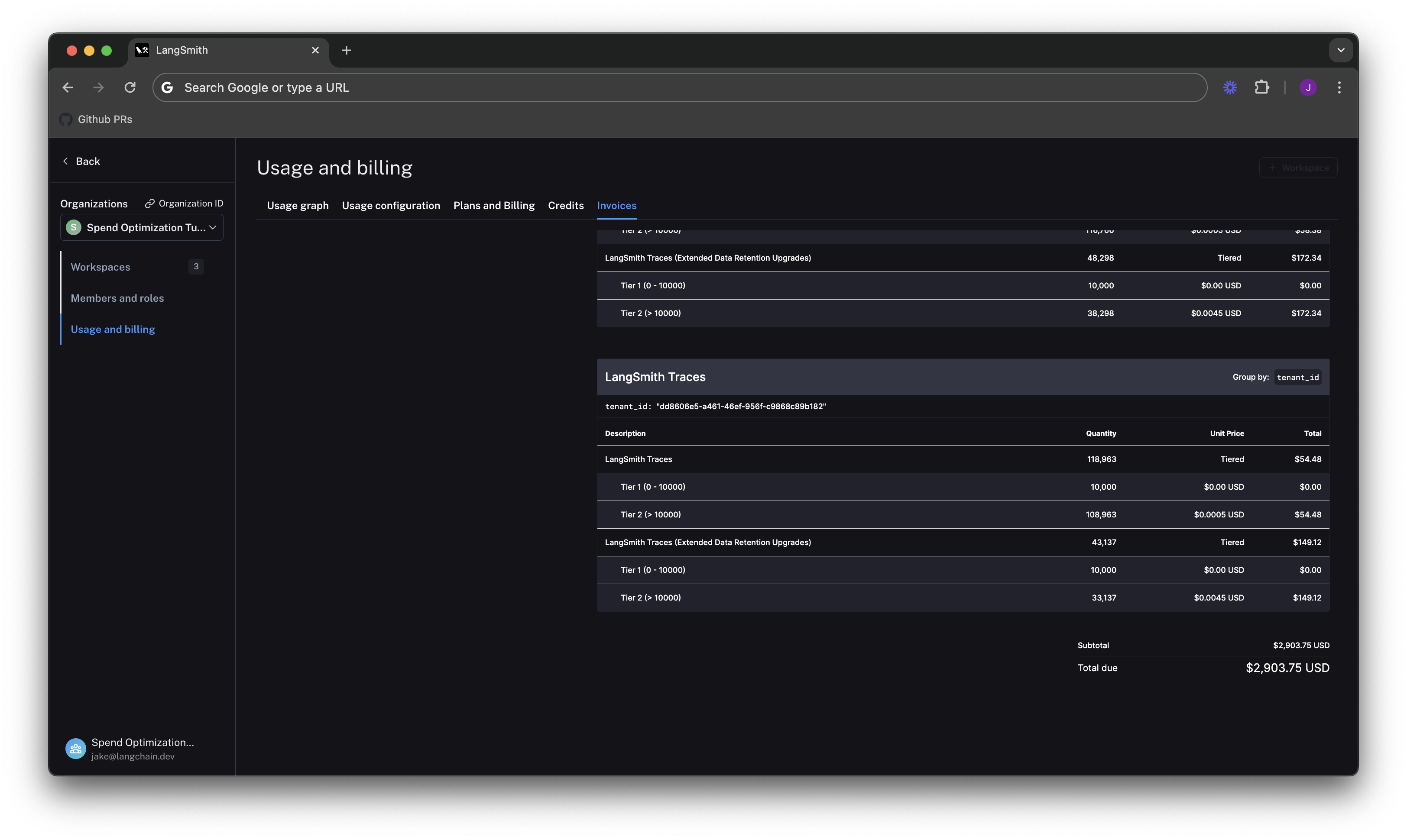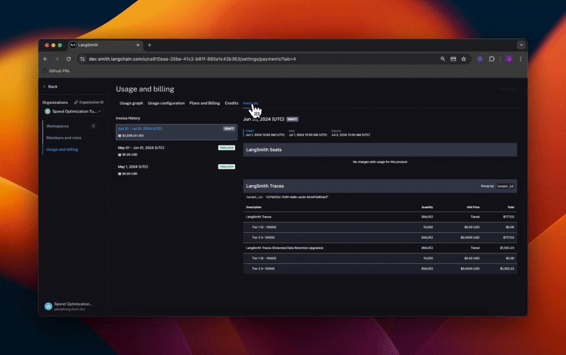 The first step of any optimization process is to understand current usage. LangSmith provides two ways to do this: Usage graph and Invoices.Usage graph