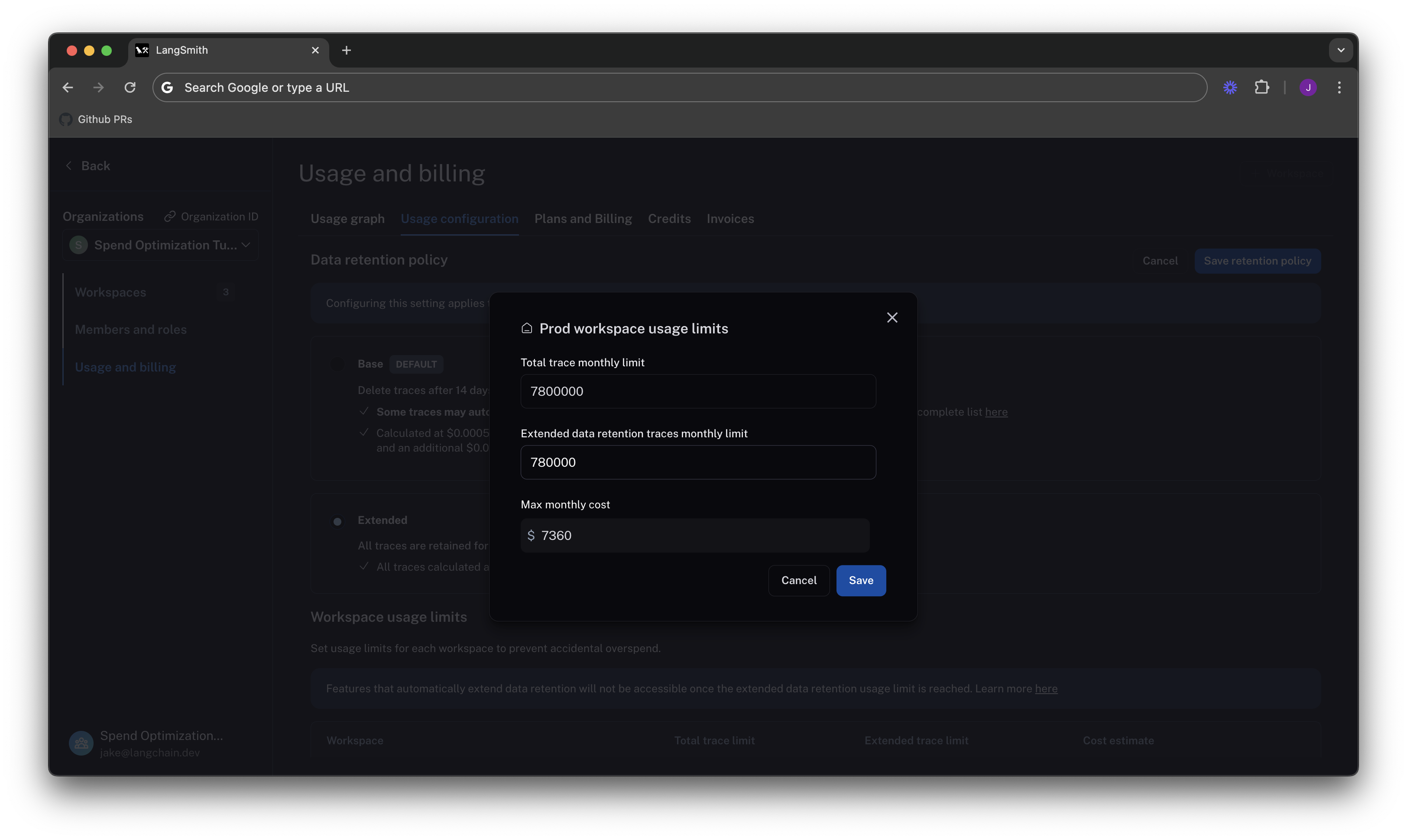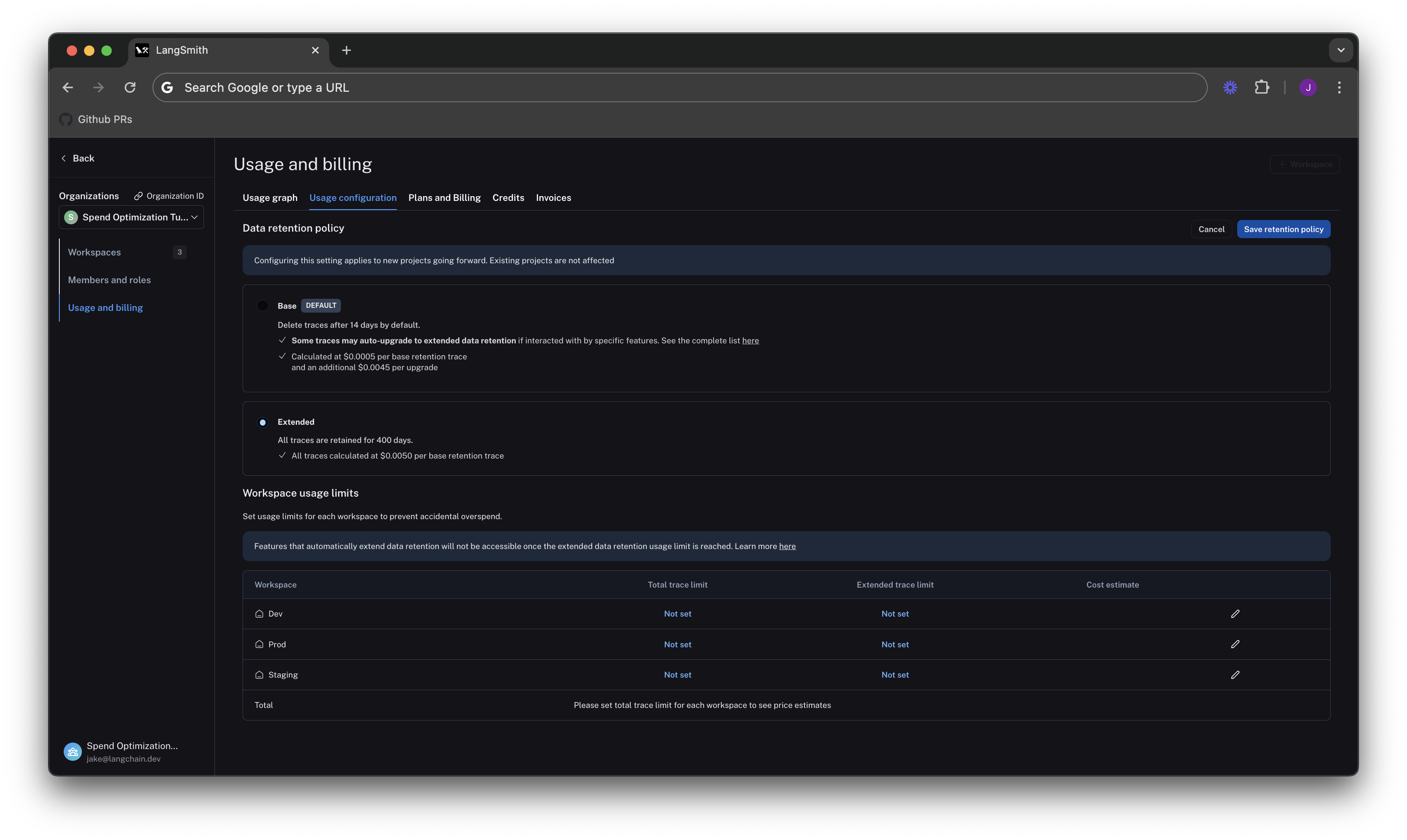 In the previous section, you managed data retention settings to optimize existing spend. In this section, you will use usage limits to prevent future overspend. LangSmith has two usage limits: total traces and extended retention traces. These correspond to the two metrics tracked on the usage graph. You can use these in tandem to have granular control over spend. To set limits, navigate back to Settings -> Usage and Billing -> Usage configuration. There is a table at the bottom of the page that lets you set usage limits per workspace. For each workspace, the two limits appear, along with a cost estimate: