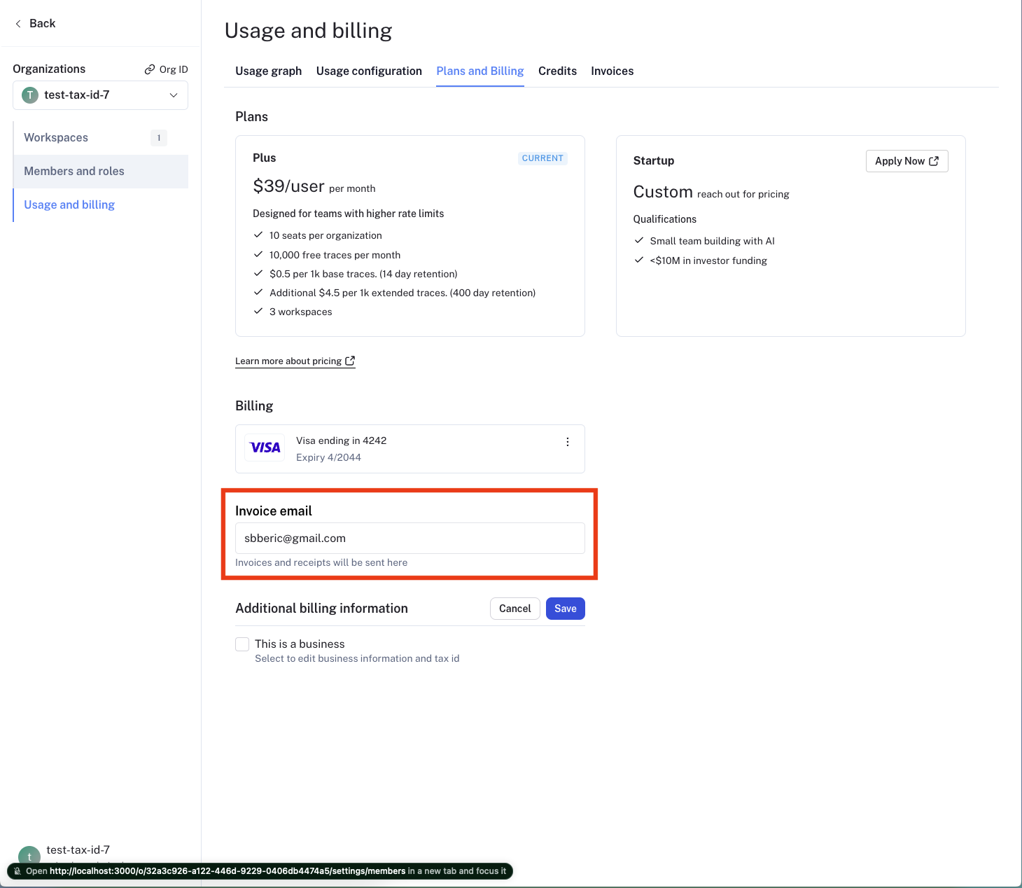 To update business information for your LangSmith organization, head to the Usage and Billing page under Settings and click on the Plans and Billing tab.Business information, tax ID, and invoice email can only be updated for the Plus and Startup plans. Free and Developer plans cannot update this information.
