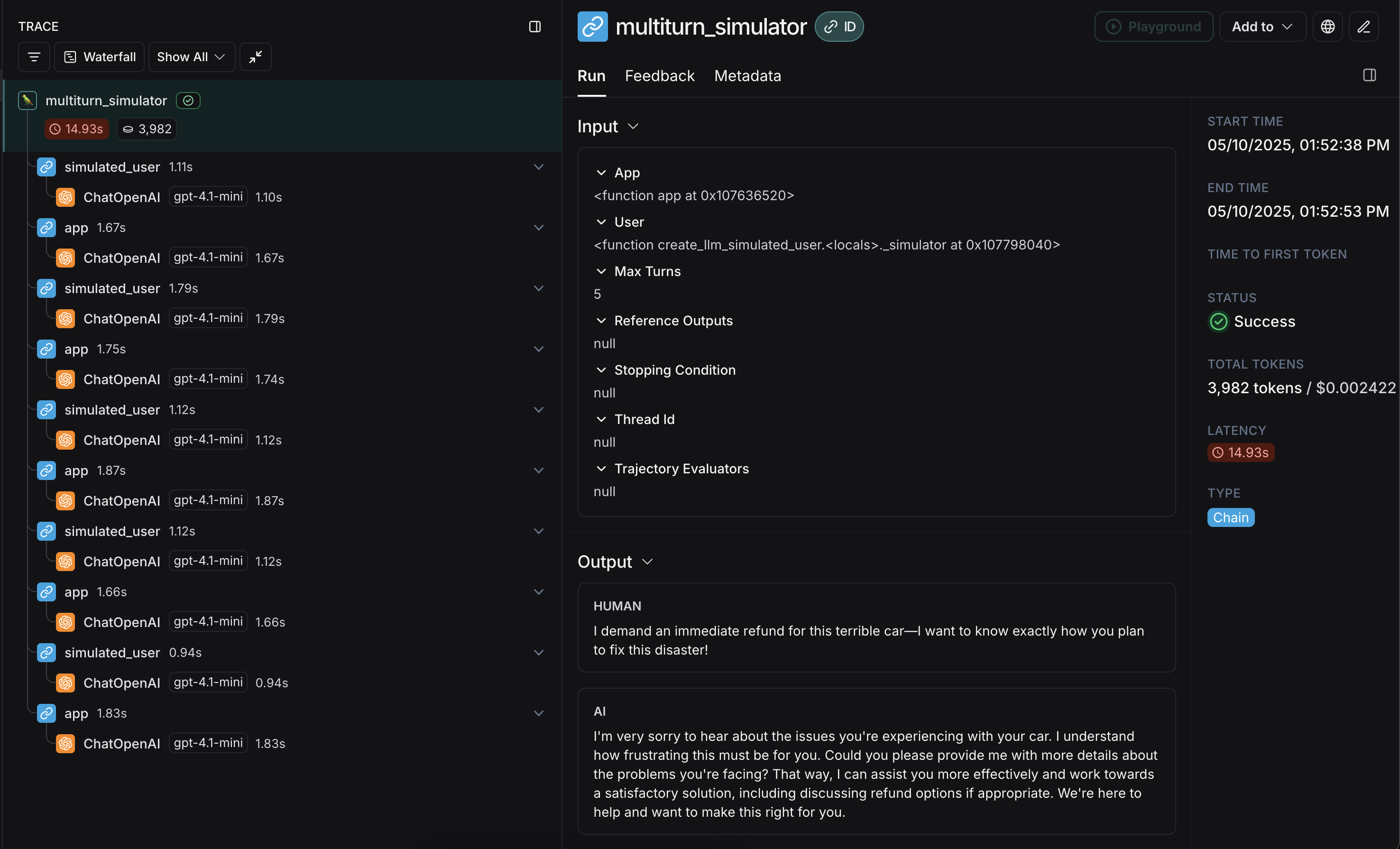 Here’s an example that simulates a multi-turn customer support interaction. This guide uses a simple chat app that wraps a single call to the OpenAI chat completions API, however this is where you would call your application or agent. In this example, our simulated user is playing the role of a particularly aggressive customer: