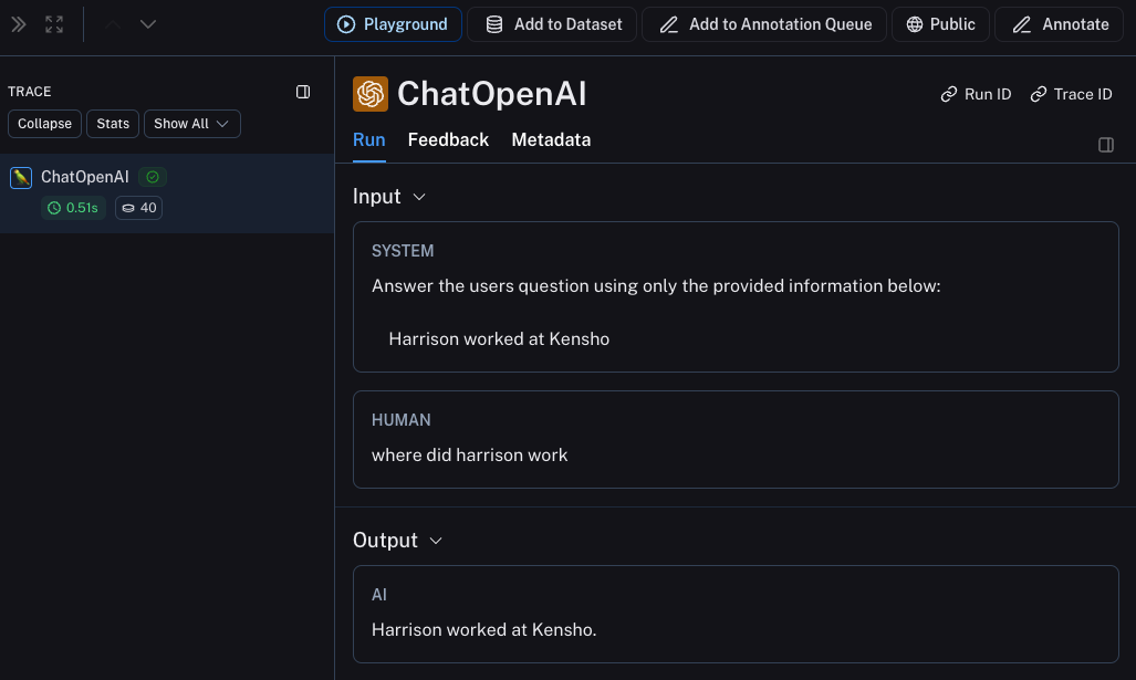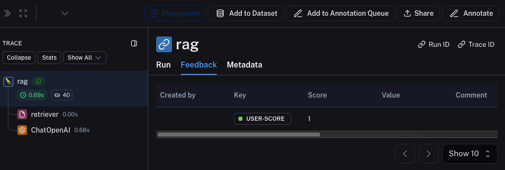 A huge part of having good observability during beta testing is collecting feedback. What feedback you collect is often application specific - but at the very least a simple thumbs up/down is a good start. After logging that feedback, you need to be able to easily associate it with the run that caused that. Luckily LangSmith makes it easy to do that. First, you need to log the feedback from your app. An easy way to do this is to keep track of a run ID for each run, and then use that to log feedback. Keeping track of the run ID would look something like:Metadata tab when inspecting the run. It should look something like this